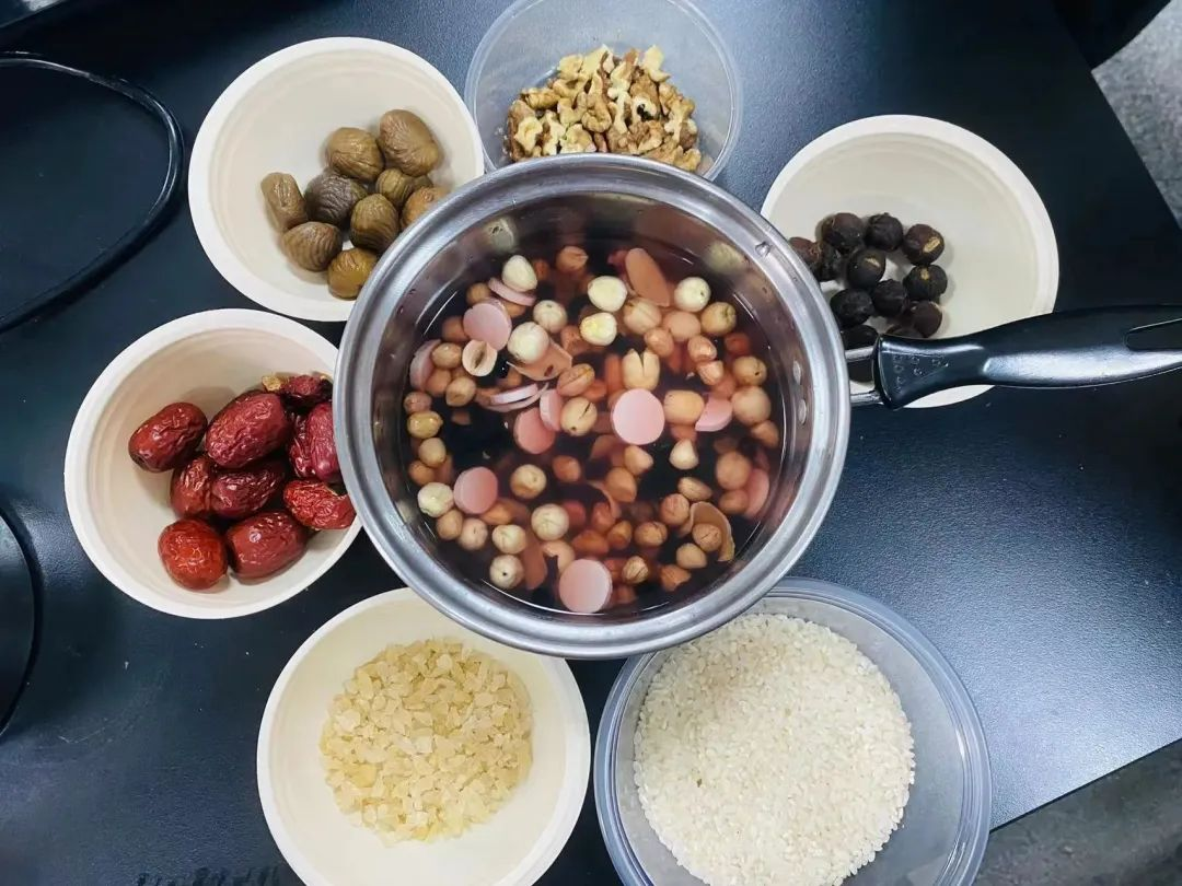 “茯苓、莲子、山药、芡实,利水渗湿,益肾固精,健脾和胃......”围着案台上新鲜出炉的“八珍糕”,参赛选手声情并茂地向评委和同学们讲解着这道药膳的制作过程和功效。 为鼓励同学们在动手参与中传承中医药膳文化,践行劳动精神,近日,我院团委联合教育部首批课程思政示范课程教学团队中药学教研室,在B13-317实验室开展“千药百味融一品,食膳汇美于杏林”中医药膳大赛。中医学院院长助理谷鑫老师出席比赛,中药学教研室刘**任及相关老师、学工办张艳梅老师担任比赛评委,郑晓宇、卢玥辰担任学生评委。 比赛开始前,谷鑫老师进行动员讲话,他表示药食同源是中医文化的特色,希望同学们能够通过亲身参与,领悟中医药的魅力,感受劳动带来的快乐,坚定专业自信。 比赛过程中,各组同学有条不紊地开始本组的药膳制作,琳琅满目的食材、药材,别出心裁的烹饪方式,洗菜时飞溅的水花,刀落砧板的清脆响声,让比赛现场的气氛迅速升温。 共有九支队伍参与此次大赛,参赛同学运用中医理论,从养胃健脾、护心暖胃等不同养生功效制作了多道可口药膳。“蘙荟探赜”队用茯苓、莲子、山药、芡实等食材制作了古代宫廷食疗方八珍糕,既能健脾益肾也能宁心安神;有添加枸杞、党参、胡椒等药材,养胃健脾、补虚益气的“猪肚包鸡”;还有取材于《古方选注》:“君以百合,甘凉清肺;佐以鸡子黄救厥阴之阴,安胃气”,加以创新,色、香、味、功效俱全的“百合冬瓜鸡子汤”。“珍珠红枣银耳汤”“全能羊肉汤”“金玉山河”......一道道精美药膳惹人垂涎,评委品尝并逐一点评了各道药膳,同时现场教学每道药膳中体现的中医配伍原则和养生功效。现场比赛结束后,评委根据药膳设计理念得分、现场制作分、vlog展示得分,综合评选出本次大赛的一二三等奖。 药膳是传统中医文化的一个重要组成部分,本次大赛旨在让同学们通过动手体验“药食同源、寓医于食”的中医药膳魅力,变被动接受为主动建构,是“课程育人”、“文化育人”的生动实践,参赛选手在药膳制作中感悟劳动精神,进一步坚定把中医药文化传承发扬光大的专业自信。